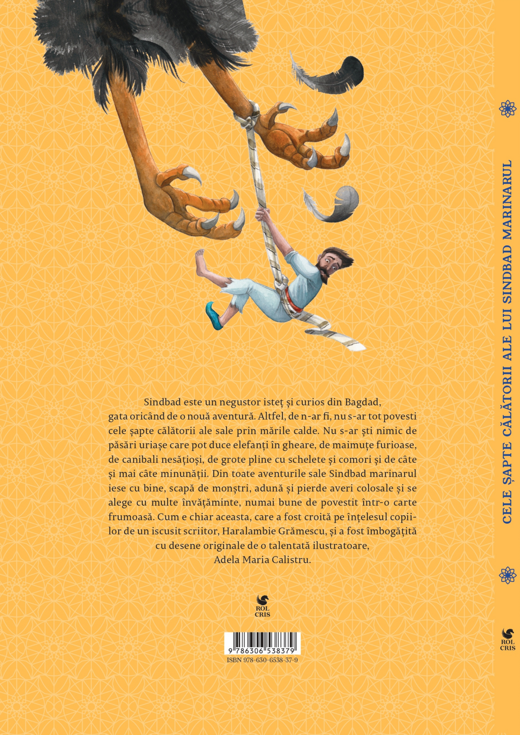 Cele sapte calatorii ale lui Sinbad marinarul. Repovestite de Haralambie Gramescu. Ilustratii de Adela Maria Calistru, Rolcris. Sindbad este un negustor istet si curios din Bagdad, gata oricand de o noua aventura. Altfel, de n-ar fi, nu s-ar tot povesti cele sapte calatorii ale sale prin marile calde. Nu s-ar sti nimic depasari uriase care pot duce elefanti in gheare, de maimute furioase,de canibali nesatiosi, de grote pline cu schelete si comori si de catesi mai cate minunatii. Din toate aventurile sale Sindbad marinarul iese cu bine, scapa de monstri, aduna si pierde averi colosale si se alege cu multe invataminte, numai bune de povestit intr-o carte frumoasa. Cum e chiar aceasta, care a fost croita pe intelesul copiilor de un iscusit scriitor, Haralambie Gramescu, si a fost imbogatita cu desene originale de o talentata ilustratoare, Adela Maria Calistru.