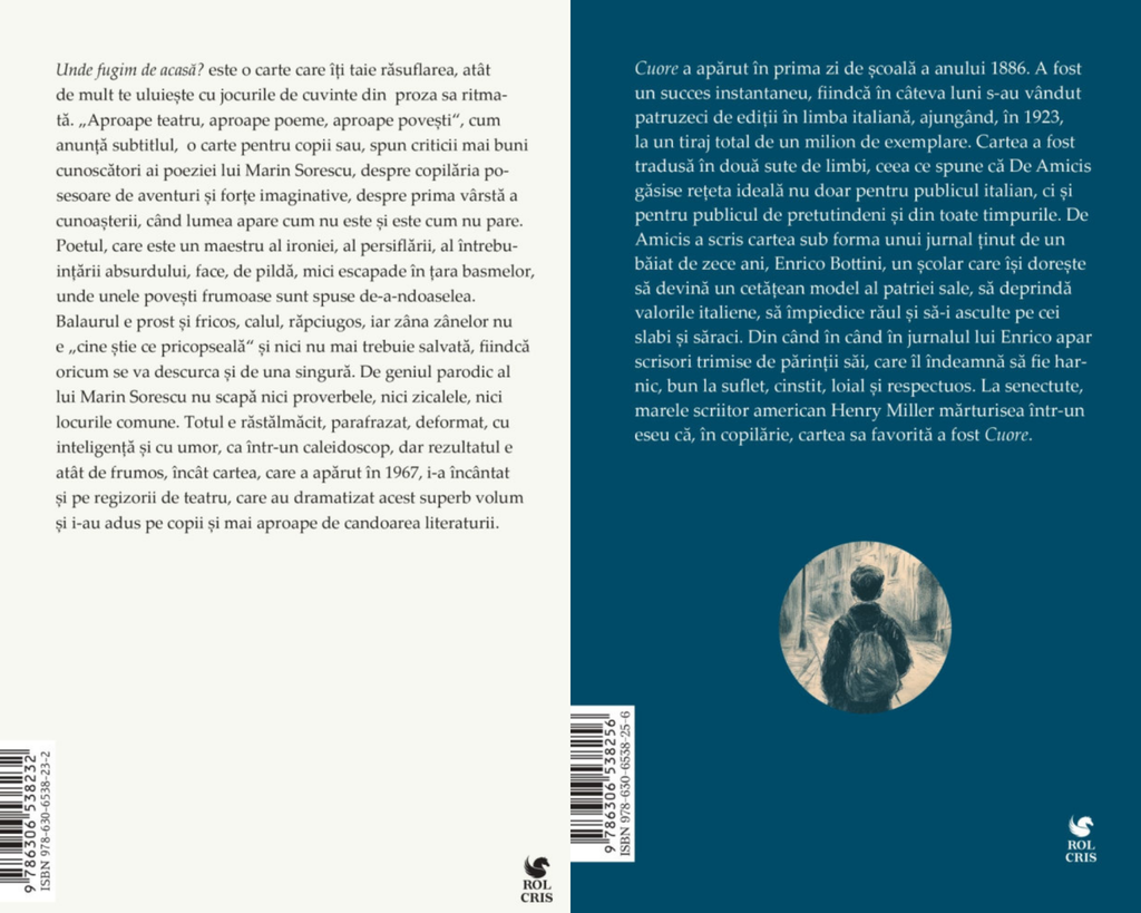 Pachet Unde fugim de acasa Marin Sorescu. Cuore. Inima de copil Edmondo De Amicis, Rolcris. Pachet Cartea cu jucarii Tudor Arghezii. Cuore. Inima de copil Edmondo De Amicis, RolcrisPachet Unde fugim de acasa Marin Sorescu. Cuore. Inima de copil Edmondo De Amicis, Rolcris