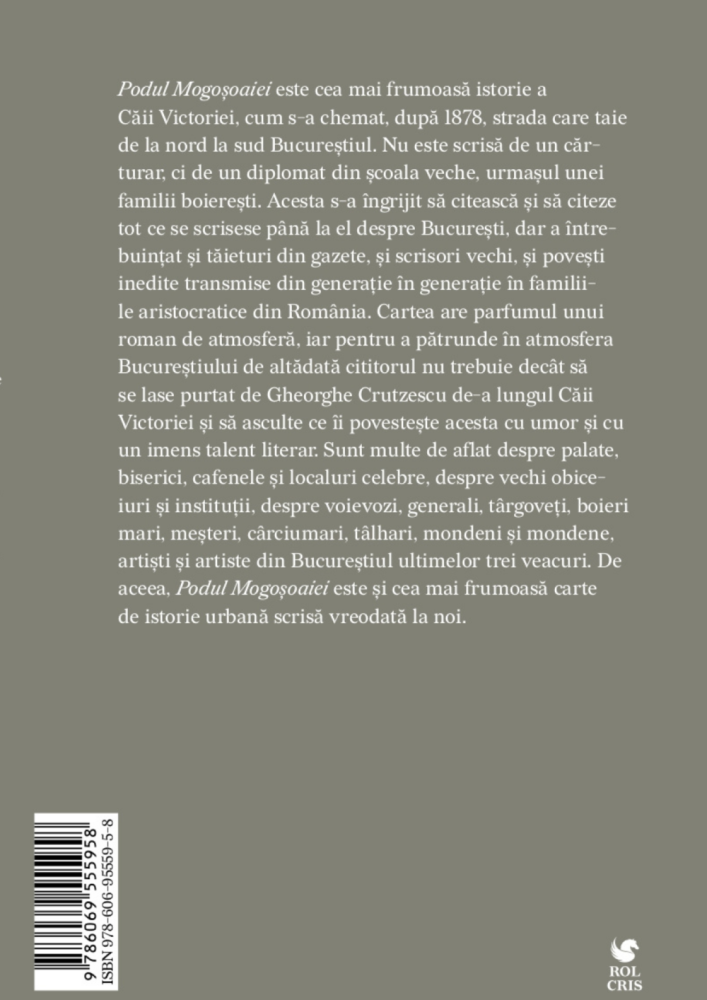 Podul Mogosoaiei, Gheorghe Crutzescu, Rolcris. Cartea lui Gheorghe Crutzescu este cea mai frumoasa istorie a Caii Victoriei, cum s-a chemat, dupa 1878, strada care taie de la nord la sud Bucurestiul. Cartea are parfumul unui roman de atmosfera, iar pentru a patrunde in atmosfera Bucurestiului de altadata cititorul nu trebuie decat sa se lase purtat de Gheorghe Crutzescu de-a lungul Caii Victoriei si sa asculte ce ii povesteste acesta cu umor si cu un imens talent literar. Sunt multe de aflat despre palate, biserici, cafenele si localuri celebre, despre vechi obiceiuri si institutii, despre voievozi, generali, targoveti, boieri mari, mesteri, carciumari, talhari, mondeni si mondene, artisti si artiste din Bucurestiul ultimelor trei veacuri. De aceea, Podul Mogosoaiei este si cea mai frumoasa carte de istorie urbana scrisa vreodata la noi. Gheorghe Crutzescu, diplomat de cariera, s-a nascut la Bucuresti, in 1890, într-o familie de boieri. Licentiat in drept, a luptat in Primul Razboi Mondial, iar in 1918 a intrat in diplomatie. A indeplinit diverse functii...Podul Mogosoaiei, Gheorghe Crutzescu, Rolcris